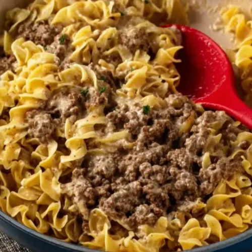 - Reduce the heat to low. Add the cooked egg noodles and browned ground beef to the skillet, stirring until everything is well combined and heated through.
