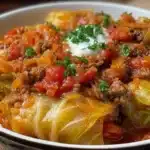 When my grandmother made cabbage rolls, the whole kitchen smelled like comfort and Sunday afternoons. But let me tell you — rolling all those little bundles? Not so comforting on a weeknight! That’s why I’m head over heels for this slow cooker unstuffed cabbage roll version. It’s got all the cozy flavors — tender cabbage, savory beef, tomatoey richness — but none of the fussy rolling. Everything simmers low and slow, just the way Grandma would’ve wanted. And the best part? You can toss it all in the Crockpot and walk away.