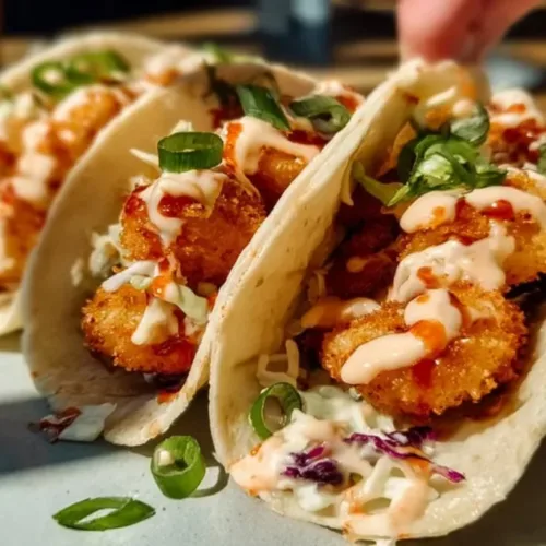 - Assemble the tacos by placing shrimp in tortillas, drizzling with the creamy sauce, and topping with slaw.