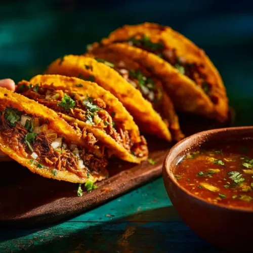 Prepare Quesabirria tacos: Heat a skillet over medium heat. Dip each corn tortilla into the broth briefly, then place it on the skillet. Add shredded meat and a sprinkle of cheese, folding it in half to cook until crispy, about 2-3 minutes per side.