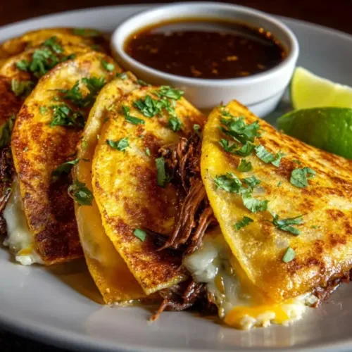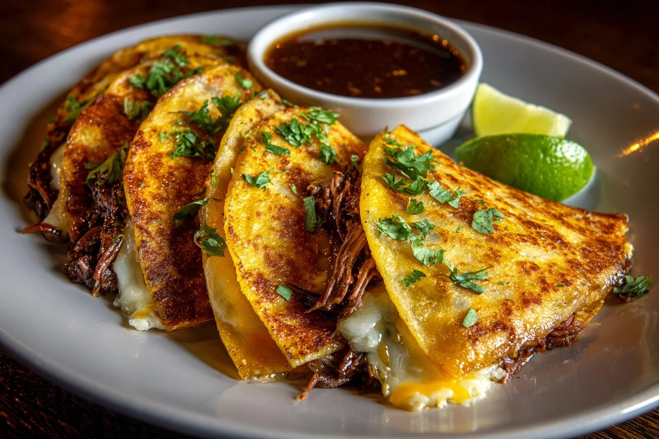 Second, the corn tortillas provide a perfect vehicle for the tender shredded beef and gooey Oaxaca cheese, creating a harmonious bite that is both comforting and indulgent.