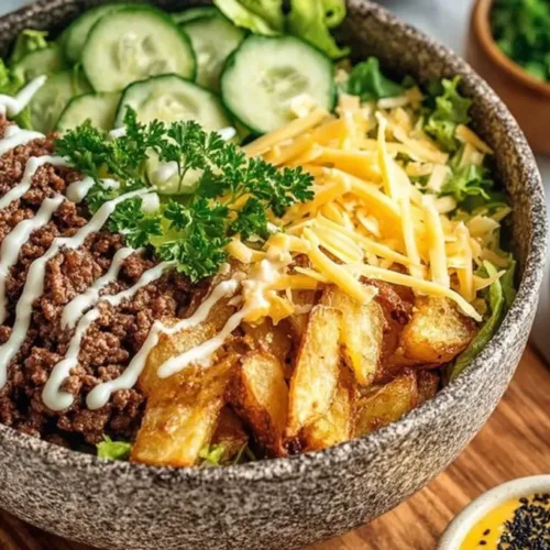 - Once the potatoes are ready, divide them among your bowls. Fill the remaining space in each bowl with shredded lettuce, then add the cooked beef mince, cheese, and pickles. Drizzle the burger sauce over the top and serve.