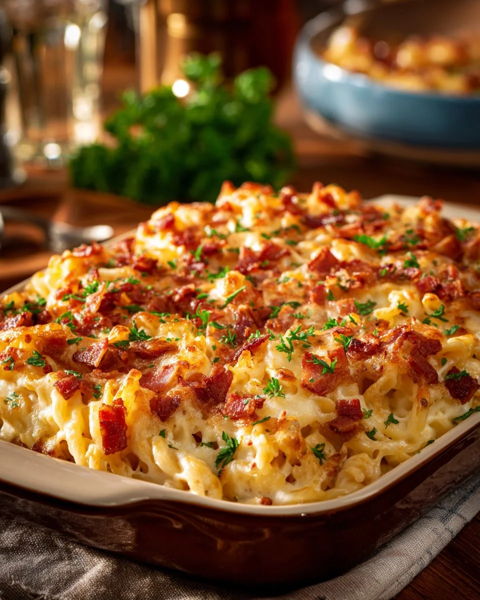 - Transfer to the dish: Pour the mixture into your prepared baking dish. Sprinkle the remaining cheddar cheese and bacon evenly on top.