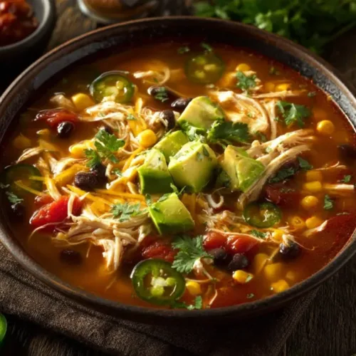 - Serve hot, topping each bowl with crunchy tortilla strips, a sprinkle of fresh cilantro, and slices of creamy avocado.