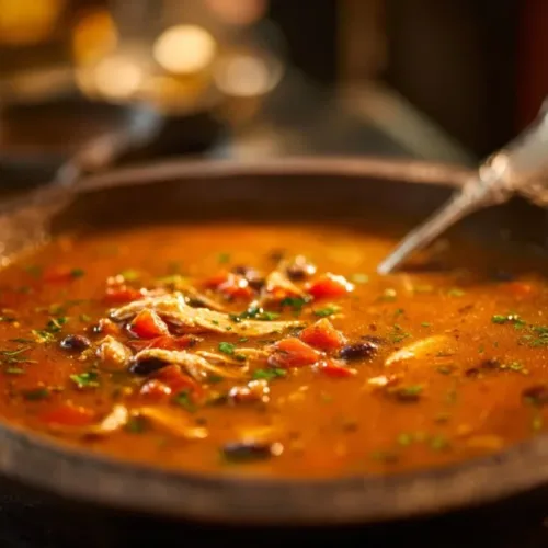 Serve hot, garnished with crispy tortilla strips, fresh cilantro, and avocado slices for an added burst of flavor.