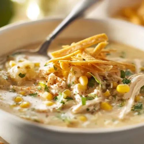 Serve this creamy chili hot, topped with sliced jalapenos, avocado, a dollop of sour cream, fresh cilantro, tortilla strips, and a sprinkle of shredded cheese for extra flavor and texture.