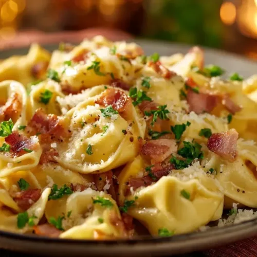 Serve: Plate the creamy tortellini carbonara immediately and garnish generously with chopped parsley to add a fresh touch.