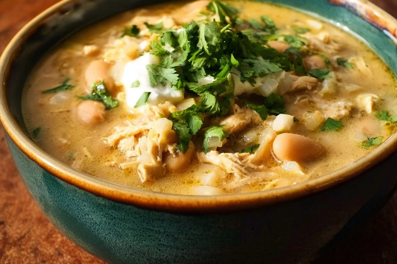 Serve this creamy white chicken chili hot in bowls. You can top it with sour cream, a sprinkle of fresh cilantro, and some tortilla chips for added crunch. It’s a perfect meal for a cozy night in or a casual gathering with friends and family.