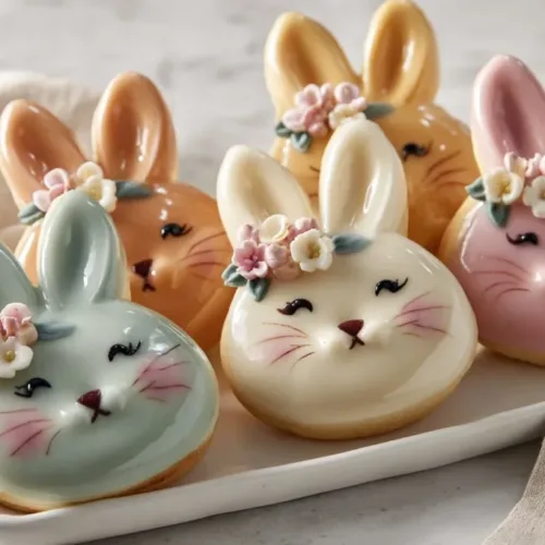 - Now comes the fun part! Decorate each bunny with icing—feel free to get creative. Add dots for eyes and a smile, and then place edible flowers on top to create a beautiful flower crown that’s as charming as it is tasty.
