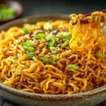 - Add the cooked ramen noodles to the pan and toss them in the sauce until well coated.