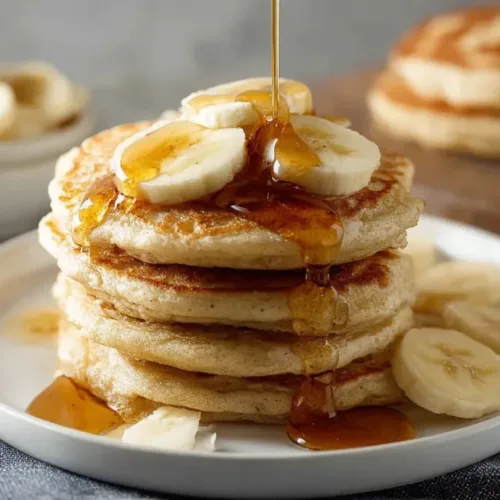 Serve these delightful pancakes warm, topped with fresh banana slices and a generous drizzle of maple syrup. You can also add a sprinkle of powdered sugar or chopped nuts for extra flavor and texture.