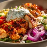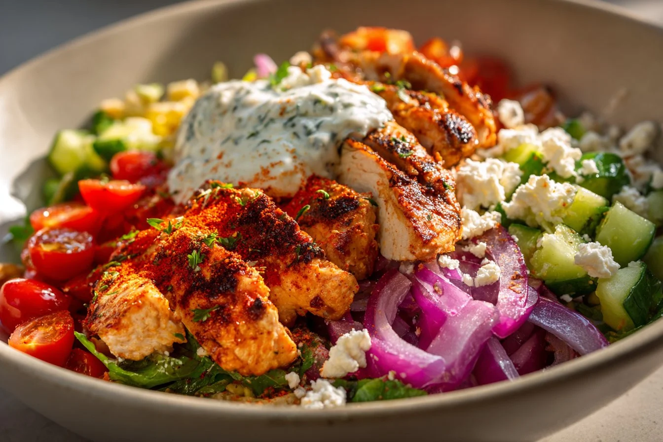 - Assemble the bowls by placing a base of fresh veggies, topped with sliced chicken, a sprinkle of feta cheese, and a dollop of tzatziki sauce.