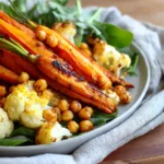- In a serving bowl, layer arugula and top with the roasted veggies and chickpeas.