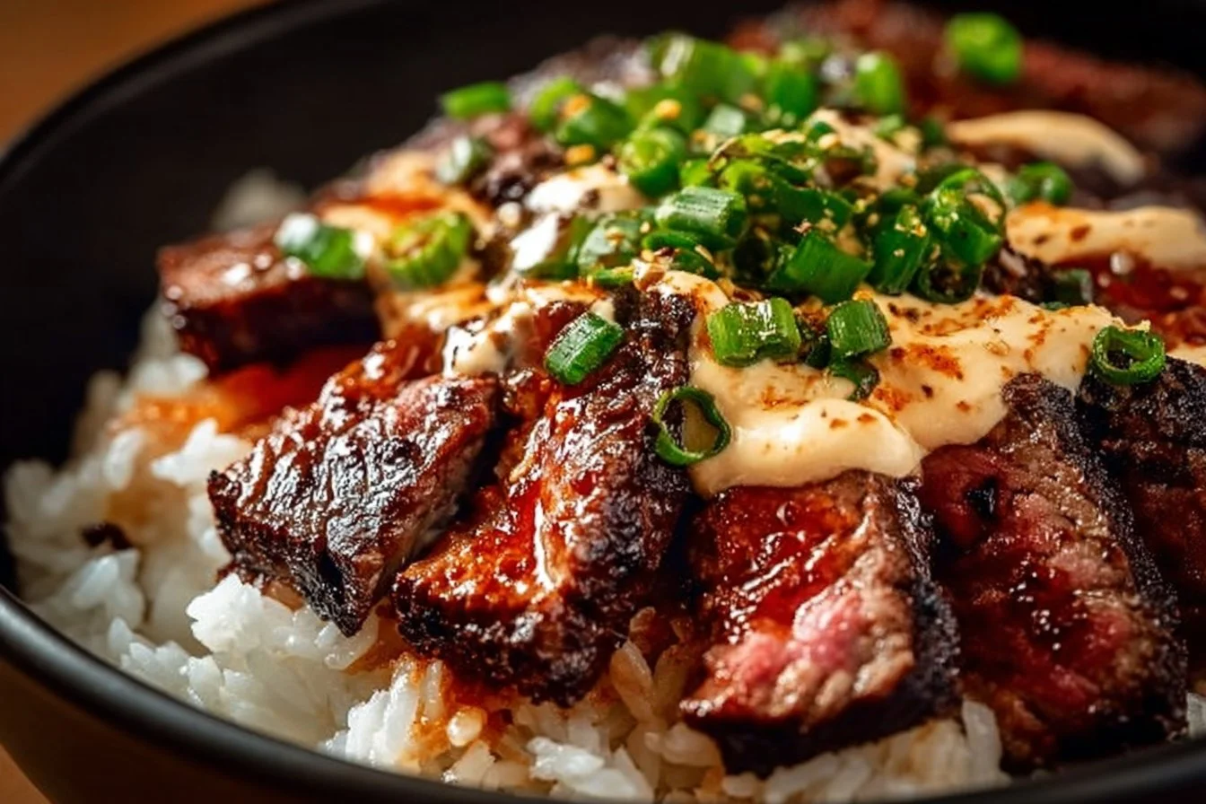 - Start with rice as the base, layer sliced steak on top, drizzle with spicy cream sauce, and garnish with green onions and sesame seeds.