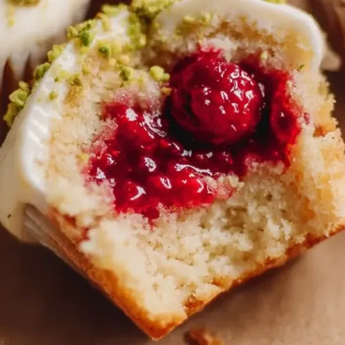 - Core the center of the cooled cupcakes and fill it with the raspberry compote. Pipe the lemon frosting around the core, then fill it with more raspberry filling. Garnish with chopped pistachios and fresh raspberries. Leave the cupcakes in the pan to core them. It’s easier to keep the cake intact, and you can remove them once cored. A piping bag with a large round tip is best used for the frosting!