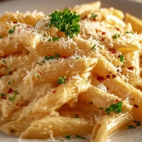 This pasta dish is best served hot. You can garnish it with extra chopped parsley or a sprinkle of more Parmesan cheese for extra flavor. Pair it with a fresh side salad or some crusty bread to complete your meal.