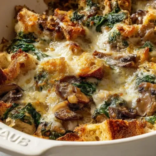 - Brush a 9×13 baking dish with melted butter and combine croissant pieces with the spinach and mushroom mixture.