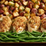 Parmesan Crusted Chicken Sheet Pan Dinner is a fantastic and convenient meal that offers a delicious mix of flavors and textures. It combines juicy chicken breasts with crispy potatoes and fresh green beans, all cooked on one pan for easy cleanup. This recipe is perfect for busy weeknights, as it takes only about an hour to prepare and cook. Plus, it’s a healthy option packed with protein and veggies that everyone in the family will love.
