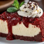- Slice the Red Velvet Cheesecake into wedges and place them on dessert plates. Optionally, drizzle with chocolate or raspberry sauce and garnish with fresh berries or mint leaves.