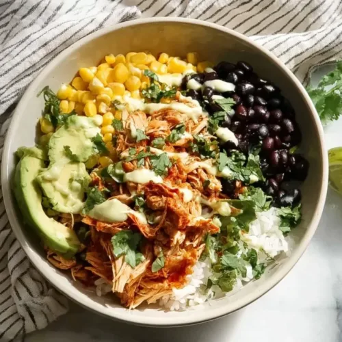 - Assemble rice bowls by adding rice, shredded chicken, corn, black beans, and diced avocados to each bowl.
