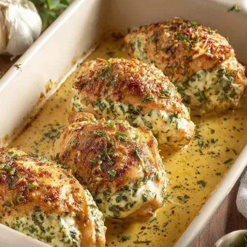 - Place the stuffed breasts in a large 9×13-inch baking dish.