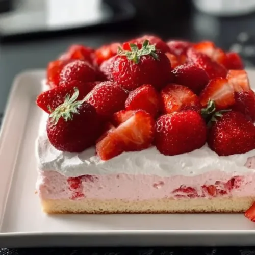 Slice the cake into squares and serve on individual plates. You can add extra whipped cream and a few strawberry slices on top for a beautiful presentation. This cake is delightful on its own, but it also pairs well with a scoop of vanilla ice cream if you want a little extra indulgence.