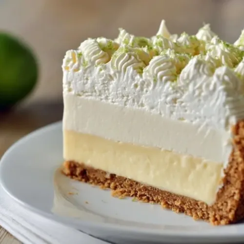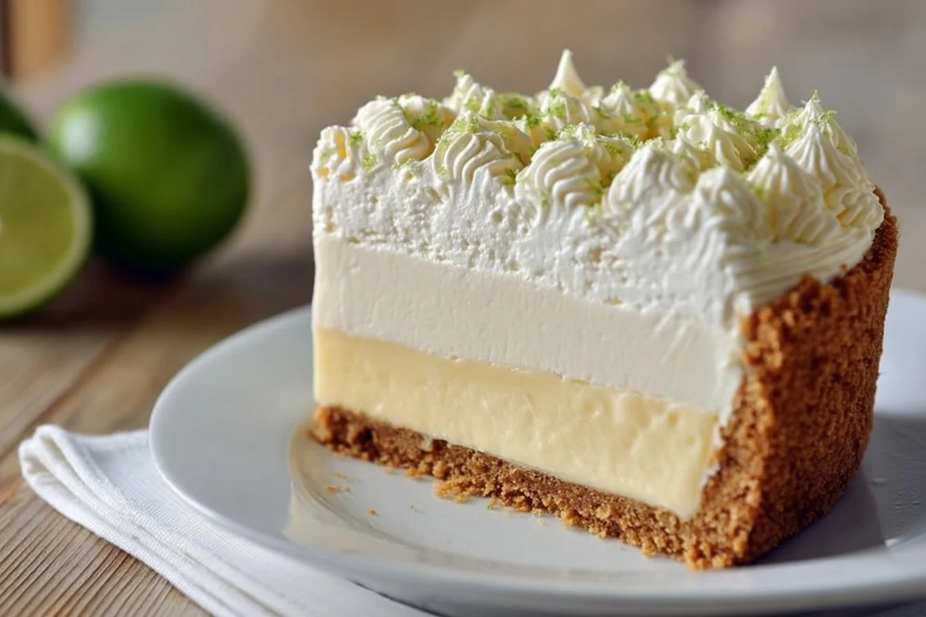 Garnish and Serve: Finish with fresh key lime slices and additional dollops of whipped cream for a beautiful presentation. Slice, serve chilled, and enjoy the delightful flavors of your triple decker key lime pie!