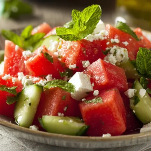 Health-conscious eaters will love the hydrating nature of watermelon and cucumber, making it a light yet satisfying dish that’s low in calories but high in flavor. This salad is also incredibly versatile; you can serve it at casual gatherings, as a refreshing side dish for grilled meats, or even as a light lunch on its own. Whip up this delightful salad, and you’ll be greeted with smiles and requests for seconds!