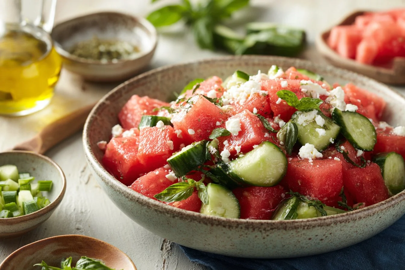 Prep Your Ingredients: Start by cutting the watermelon into bite-sized chunks and roughly chopping the cucumber, mint, and basil. Carefully add all these fresh ingredients into a large salad bowl.