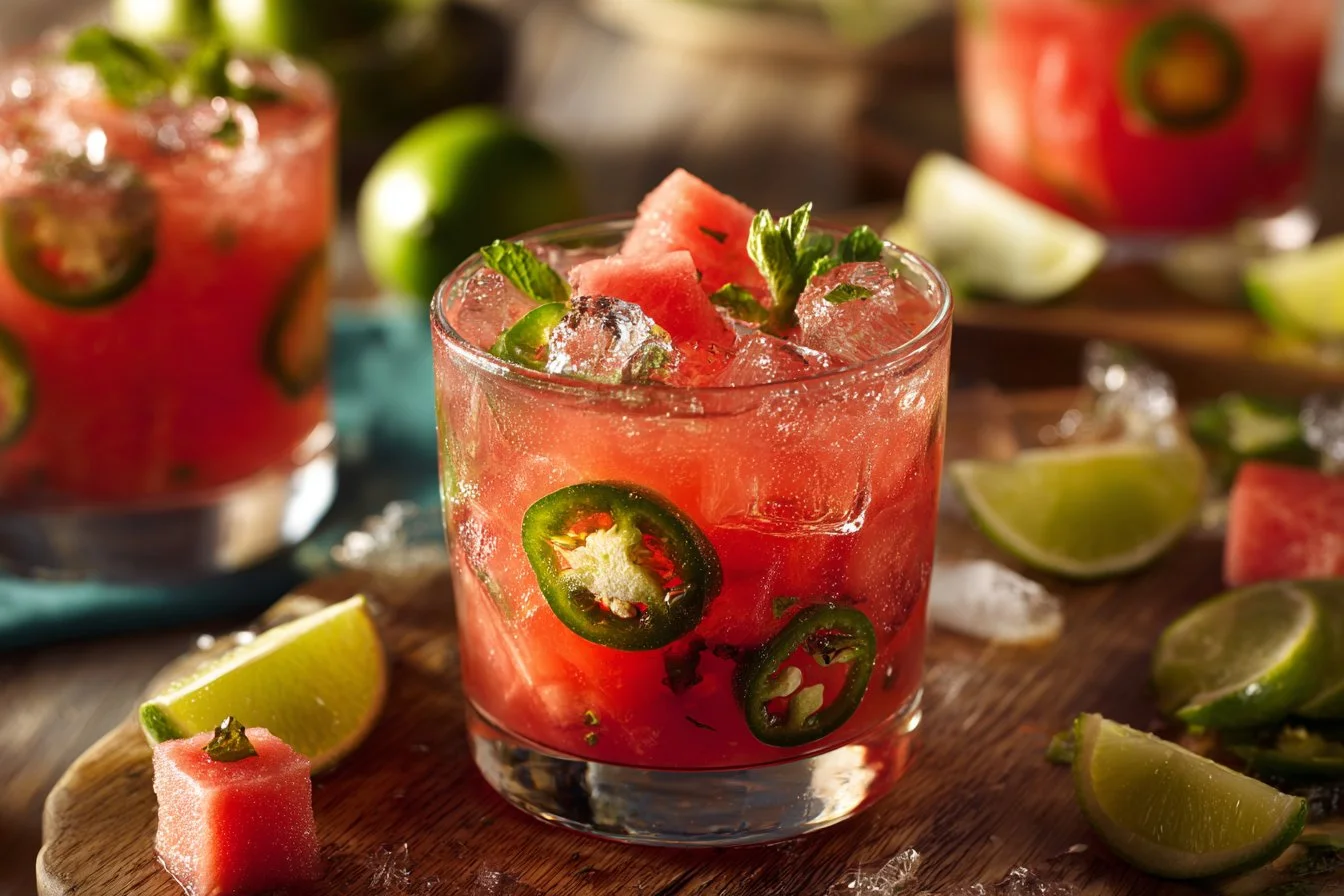 - Garnish each drink with a slice of jalapeño or watermelon on the rim and serve immediately while chilled.