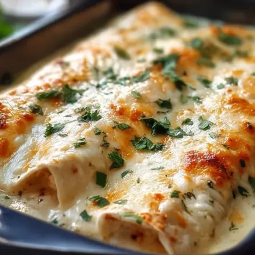 - Pour the remaining white sauce evenly over rolled enchiladas, ensuring they’re completely covered.